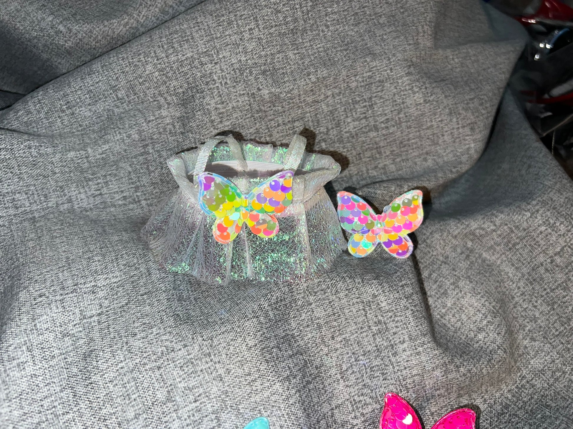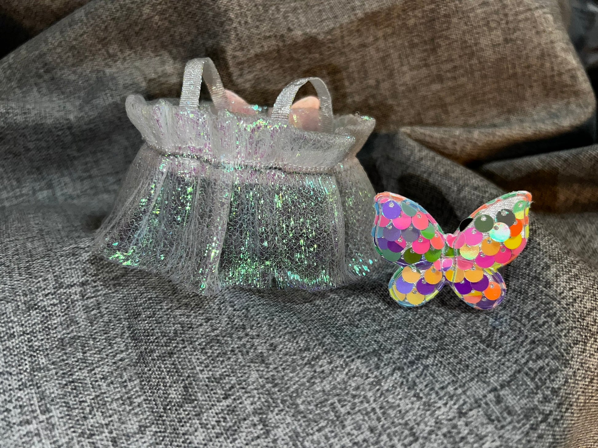 This amazingness of this iridescent dress is hard to capture in photos and videos. But it is perfection! With an elastic waistband and ribbon straps, it's easy to put on and stays on. Butterfly attached to the back of the dress permanently (you COULD wear it backwards with the butterfly on the front). It will come with a butterfly attached to a pinback for your dolls little head, like you would wear a bow.