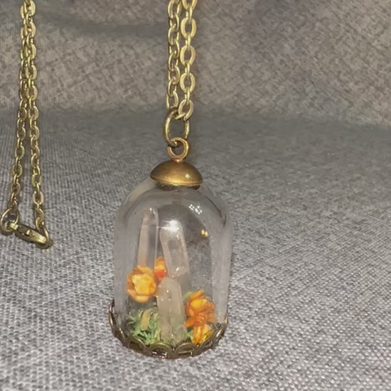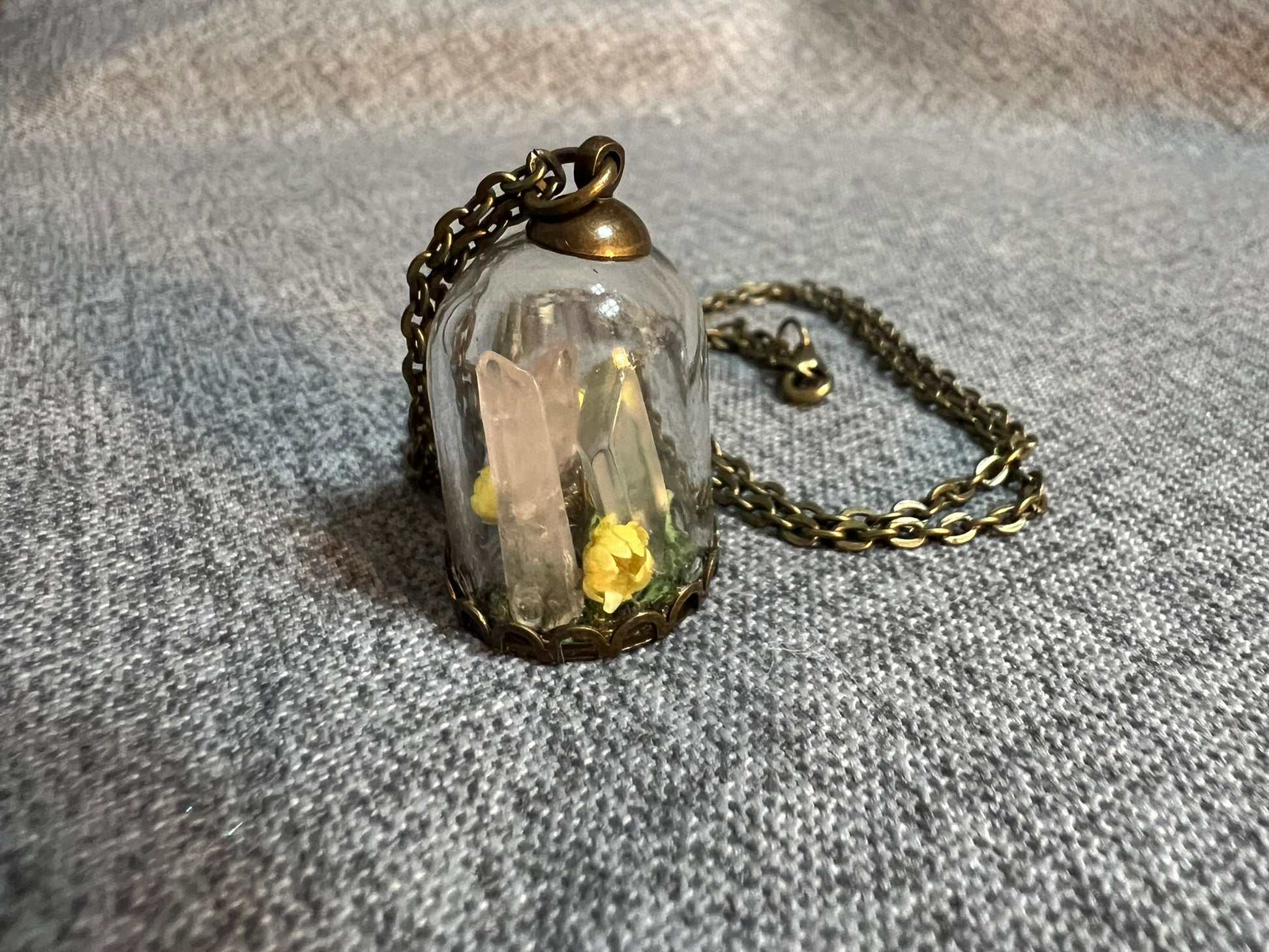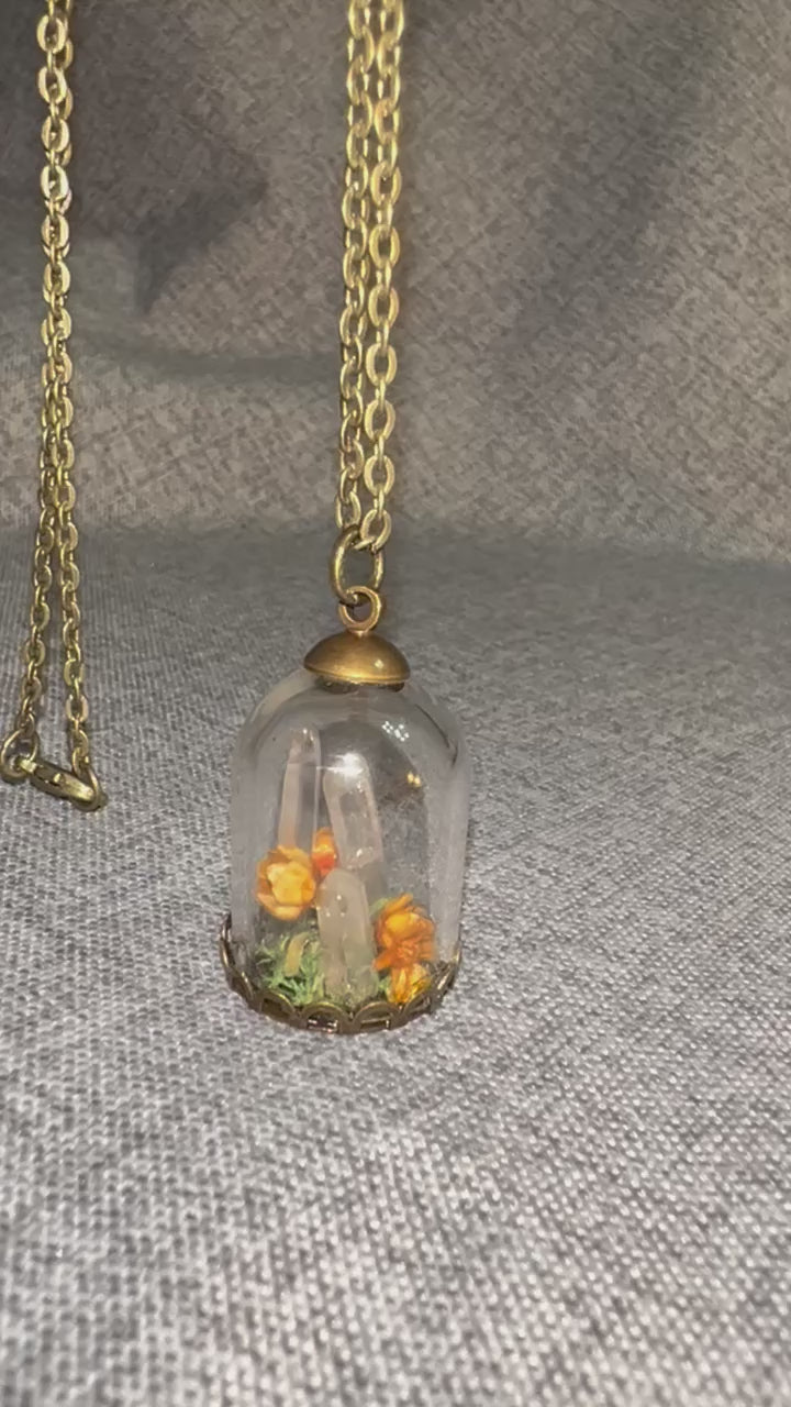 Quartz Crystal & Dried Flower Glass Dome Pendant - Antique Bronze Necklace
